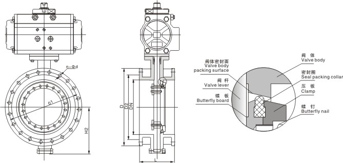 蝶板的回轉(zhuǎn)中心(即閥桿的中心)位于閥體的中心線和蝶板的密封面截面上。