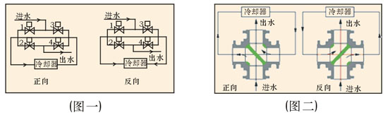 該四通換向球閥,一 閥實(shí)現(xiàn)正反供水切換,每轉(zhuǎn)90 ,供水方式切換一次,以前需四個(gè)閥門,供水時(shí)閥1、4 開啟,閥2、3關(guān)閉;反向供水時(shí)閥2、3開啟,閥1、4 關(guān)閉(圖一),現(xiàn)用一臺(tái)四通球閥(圖二)替代,操作方便。
