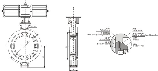 軟硬層疊式金屬密封結(jié)構(gòu):蝶板密封圈采用軟硬層疊式不銹鋼片和柔性石墨板的密封面,使其具有金屬硬密封和彈性密封的雙重優(yōu)點,無論在低溫和高溫工況下均具有優(yōu)良的密封性能。