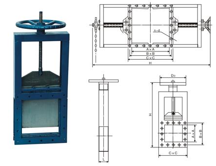 主要由框架、閘板、絲桿、螺母等零件構成,用手轉動手輪使絲桿帶著絲桿螺母和閘板沿水平方向往復運動,達到閘門的啟閉目的。