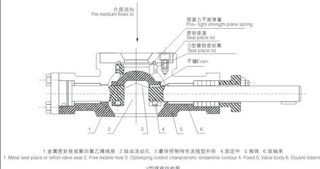 V型球閥采用帶彈簧或板簧加載閥座結(jié)構(gòu),由于彈簧/板簧的彈性恢復(fù)力推動(dòng)閥座,可使球芯與閥座之間長(zhǎng)期具有良好的密封性能。同時(shí)由于閥座采用彈簧加載的活動(dòng)結(jié)構(gòu),可使閥座自動(dòng)校正,以達(dá)到與球芯的最佳吻合。